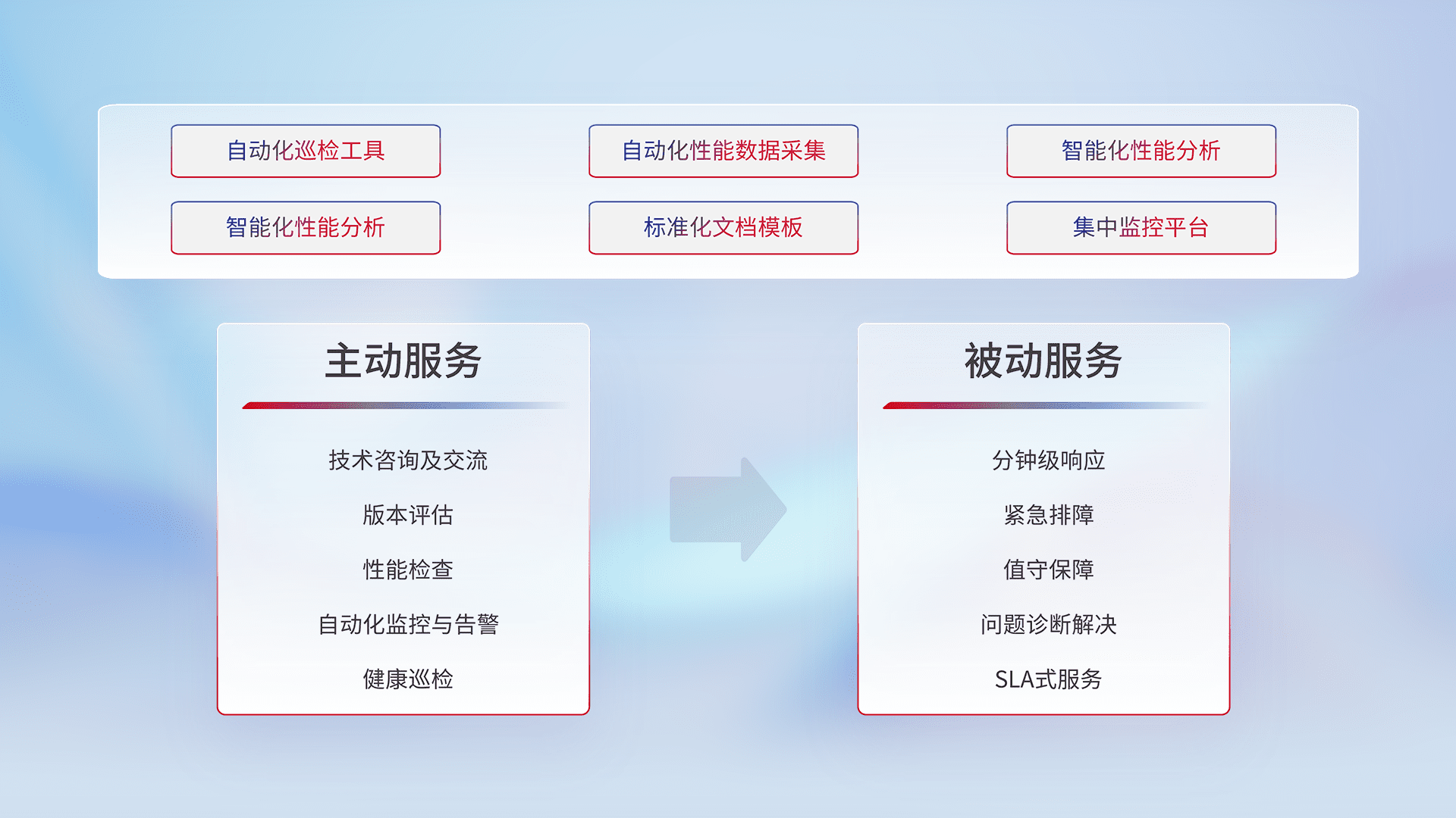 智能化工具和标准化文档,,保障服务质量,,,提供主动服务(包含技术咨询、、、、版本评估、、性能检查、、自动化监控与告警、、、健康巡检)和被动服务包含(分钟级响应、、紧急排障、、、值守保障、、、问题诊断解决、、、SLA服务)。。。